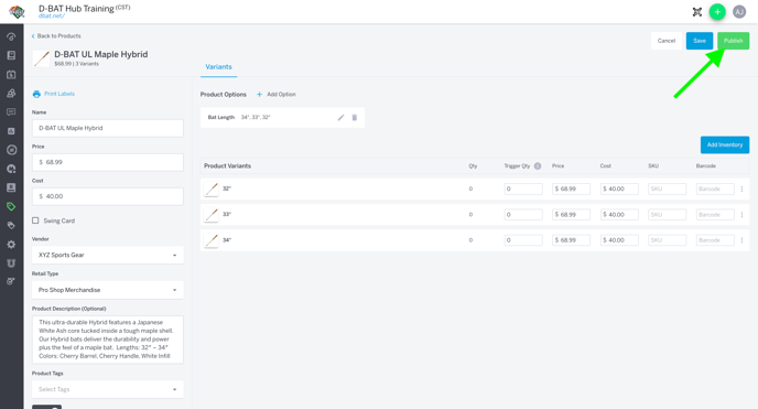 - Your saved product will default to status Unpublished status. This means it is not yet available for sale in POS. When you're ready to sell this product all you have to do is to click Publish when editing or use the 3 dot menu on the the product card to Publish.
